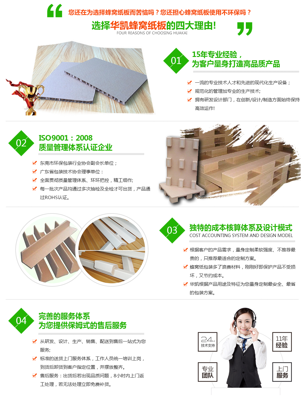 東莞市華凱紙品有限公司成立于2001年,注冊資金200萬元。是廣東省東莞市一家專業從事研發生產和銷售蜂窩紙板、蜂窩紙芯、蜂窩紙箱、蜂窩內襯、紙卡板(紙棧板、紙托盤)、紙護角(護角紙)、紙滑板等各類環保包裝材料及蜂窩制品加工技術和設備的高新技術企業。產品廣泛應用于印刷、文具、玩具、拼圖、相冊、皮具、電器、家具、五金機械、倉儲運輸、陶瓷、建筑裝飾等行業。蜂窩紙板可以替代木材、發泡膠(EPS)、珍珠棉,可循環再生,是出口產品理想的環保包裝材料。紙棧板用來代替木卡板、塑膠棧板出口裝貨柜使用,免熏蒸,材料符合RO...